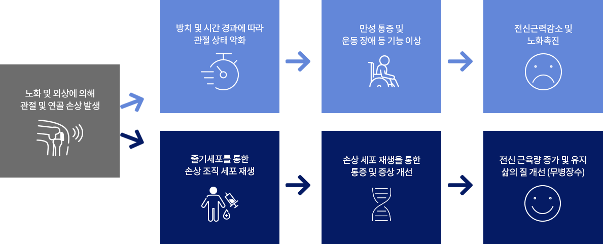 연골은 노화로 인한 수분 감소, 스포츠 활동 중 외상이 아니더라도 쓰면 쓸수록 닳는 부위인 만큼 손상되기 쉽지만 스스로 회복이 어려운 부위이므로 중증도 단계 이상의 상태에서는 줄기세포를 통한 치료를 빨리 시행하여 관절건강을 회복하고 가속 노화를 억제하여 근육량 증가 및 활동력 향상을 통한 무병장수를 추구할 수 있습니다.