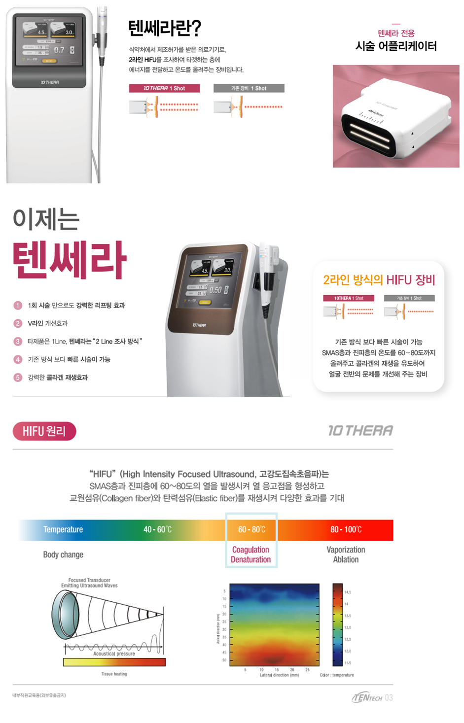 기존 HIFU 초음파 기기는 1줄로 에너지가 조사되는데 텐쎄라는 동시 2라인 조사방식으로 200샷 시술 시 400샷 유사효과를 기대할 수 있으며, 2라인 조사 방식으로 시술시간은 단축할 수 있습니다.
