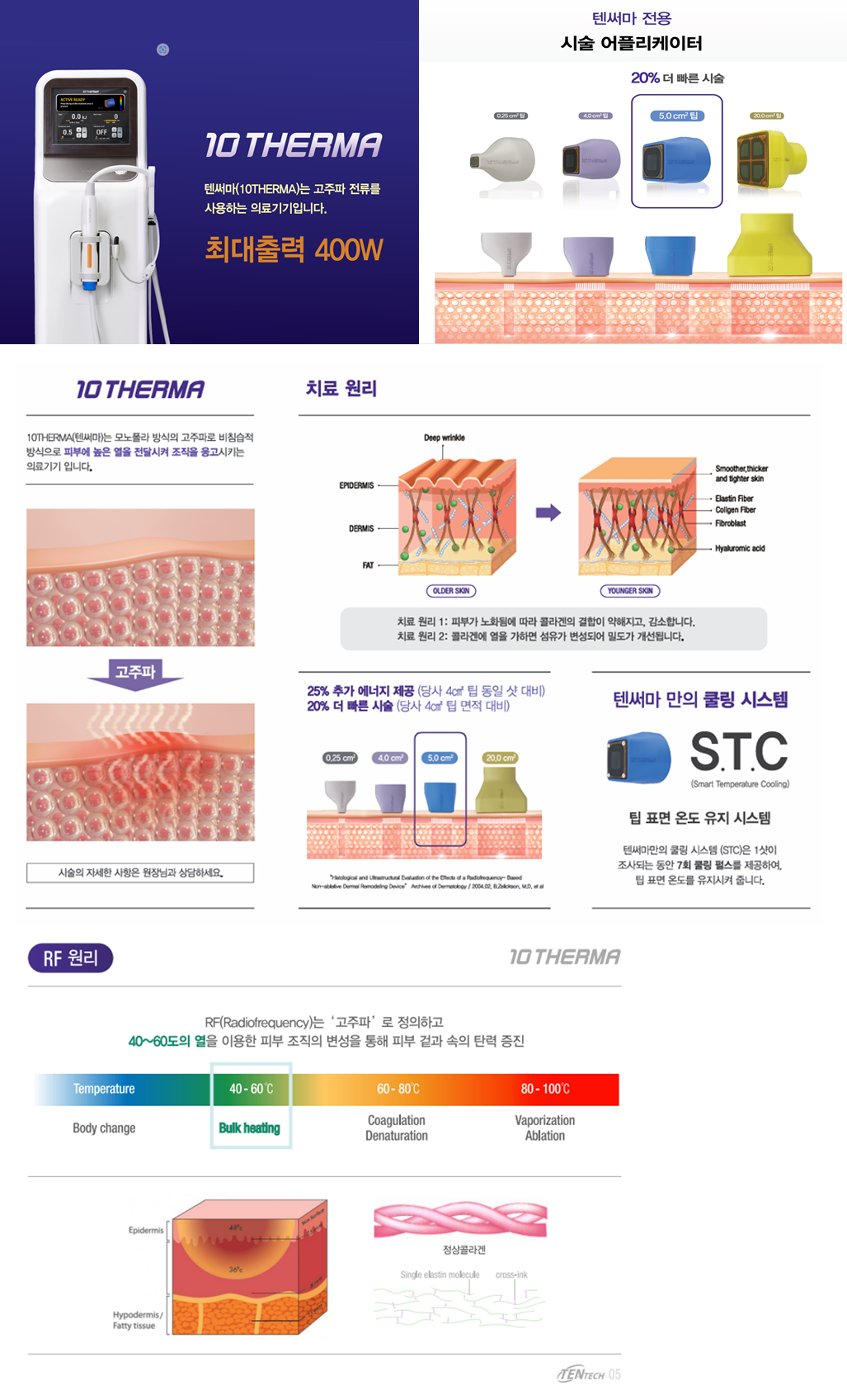 즉각적인 콜라겐 수축으로 인한 탄력개선효과를 기대할 수 있는 텐써마는 국내기술로 한국인의 특성에 맞게 제작된 장비로 가성비 높은 고주파 장비 이며, 혁신적인 쿨링시스템로 시술시 열감과 통증을 줄여줍니다.