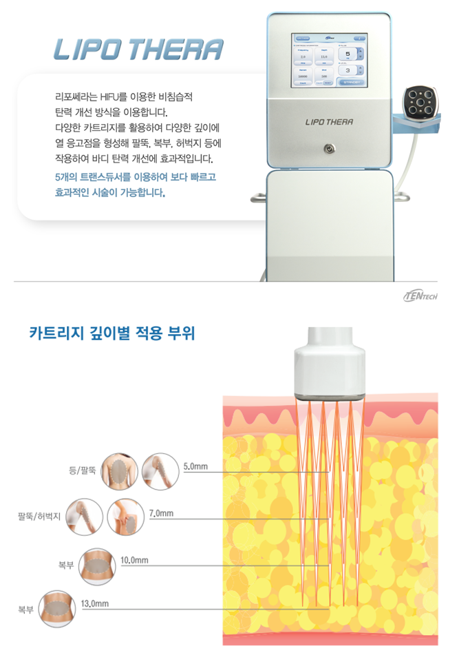 고강도 집속형 초음파 (HIFU)의 강한 열(60~80ºC)을 비침습적으로 피하지방층에 포커싱, 피부 표면의 손상없이 지방조직을 감소시키는 body shaping 기기입니다.